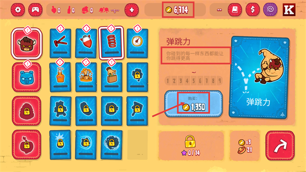 1、在功能界面中,当前金币为【6714】,可消耗【1350】购买【弹跳力】(效果为碰到物品跳更高),提升角色能力以推进后续关卡。