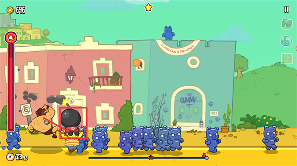 2、战斗场景中金币为【696】,面对带炸弹的敌人,操控角色应对该目标,同时推进【CANDYLAND-REVENGE】相关关卡进度。