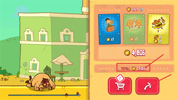 4、结算界面显示总金币为【21064】,获取对应奖励卡片后,点击界面中的箭头按钮,即可继续进入后续的游戏关卡。