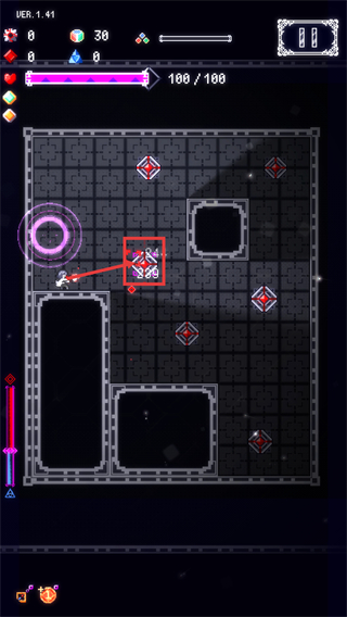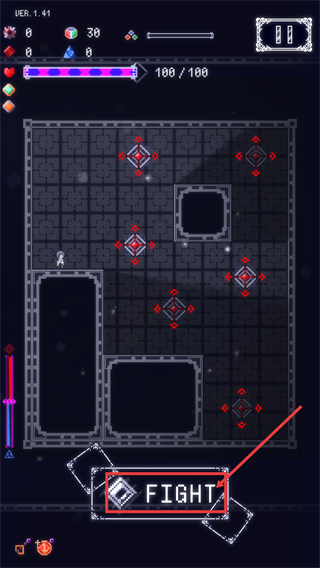 1、当前生命值【100/100】,界面分布多个红色菱形敌人,点击【FIGHT】按钮,进入战斗阶段来应对这些敌方目标。