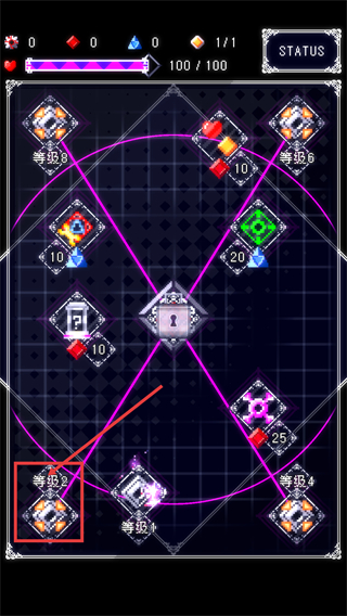 1、这是角色属性-等级界面,生命值【100/100】,选择界面中的【等级2】节点,可提升对应能力,推进角色养成与关卡适配进度。