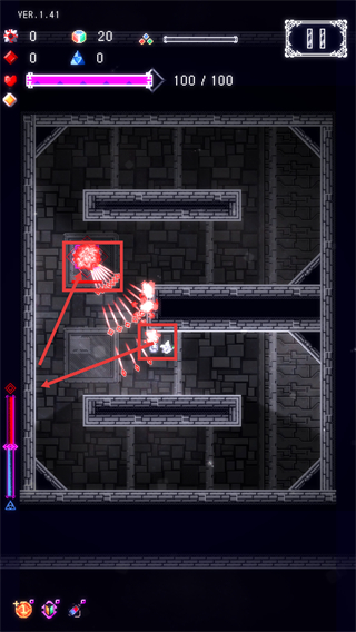2、战斗场景中生命值【100/100】,操控角色规避带红色攻击特效的装置,躲避其攻击的同时,推进当前区域的探索进程。