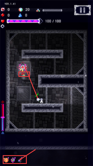 3、当前生命值【100/100】,操控角色移动至道具箱位置获取物品,借助底部道具辅助,继续探索当前的战斗区域。