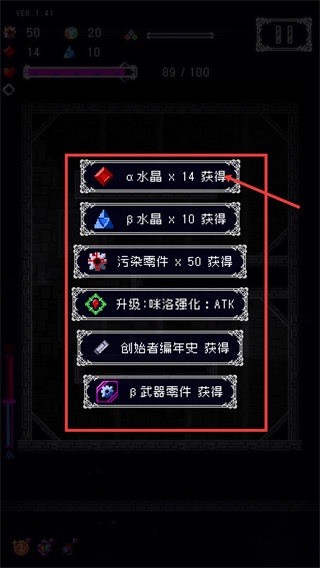 4、战斗结算后获得【α水晶-x14】【β水晶-x10】等资源,还有【升级-咪洛强化-ATK】等道具,这些可用于角色养成与道具升级。