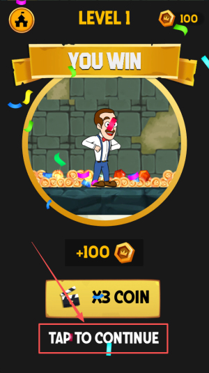 4、领取胜利:当画面出现“YOU WIN”与“+100 X3 COIN”时,轻点“TAP TO CONTINUE”即可领取奖励并进入下一关。