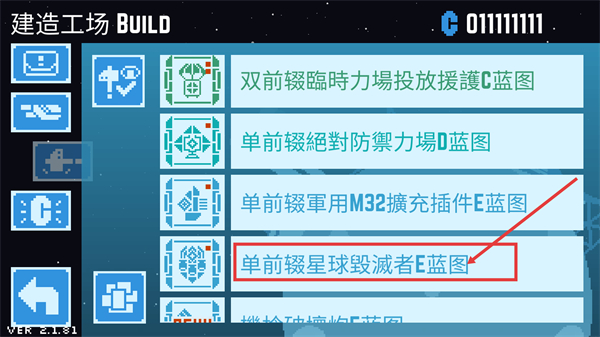 1、在建造工场界面选择【单前缀星球毁灭者E蓝图】,这类蓝图是建造对应装备的前提,需先选定目标蓝图。