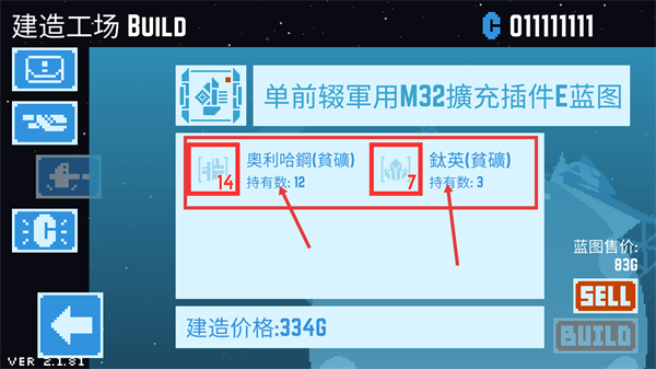 2、建造【单前缀军用M32扩充插件E蓝图】需消耗【奥利哈钢(贫矿)】14个与【钛英(贫矿)】7个,需确认自身持有数是否满足。