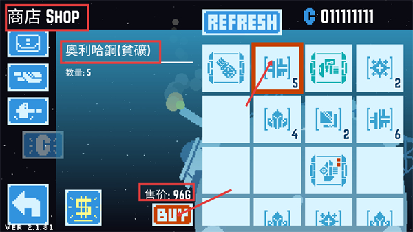 3、在商店界面可购买【奥利哈钢(贫矿)】,当前售价为96G,素材不足时可通过此方式补充以推进建造。