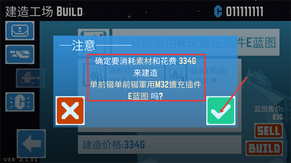 4、建造前会弹出确认弹窗,确认消耗素材与334G后,点击绿色对勾即可完成【单前缀军用M32扩充插件E蓝图】的建造。