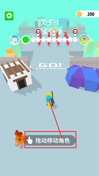 1、按照提示【拖动移动角色】,操控角色向【关卡1】的敌人区域移动,开启关卡进程。
