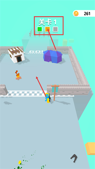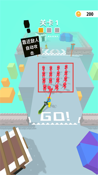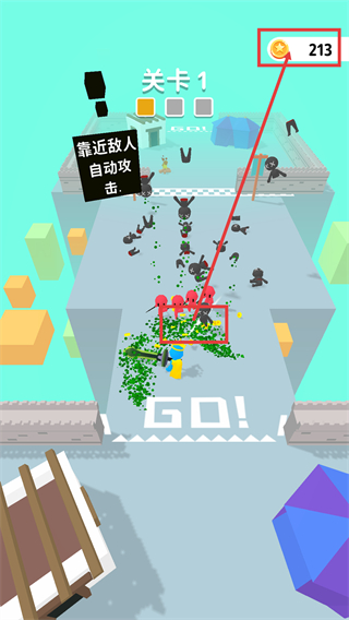 2、靠近【红色敌人】群体,角色会自动攻击,集中消灭敌人以推进关卡进度。