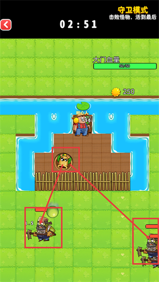 2、在【守卫模式】中,利用防御单位攻击【怪物】,同时关注【大门血量-50/50】状态,避免大门被破坏。
