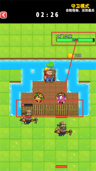 3、当【大门血量】下降时,需补充防御单位,击败怪物可获得【+50】资源,用于强化防御能力。