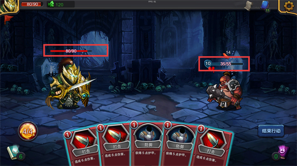 3、当自身血量下降时,使用【防御】卡牌获得护甲,同时持续用【打击】削减敌人剩余【35/55】血量。