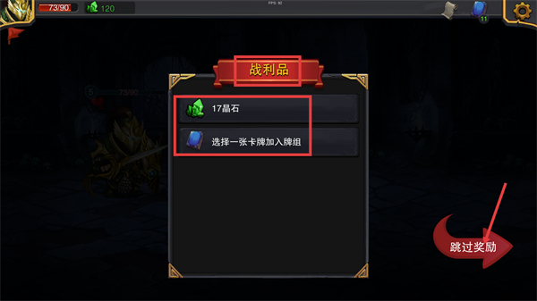 4、击败敌人后可获得【17晶石】与【选择一张卡牌加入牌组】的战利品,也可点击【跳过奖励】继续。