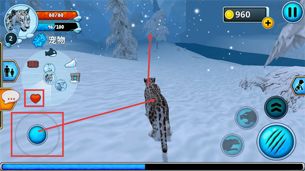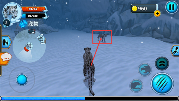 2、操作设计兼顾真实与便捷,虚拟摇杆控制移动环顾,一键切换奔跑、攻击状态,还支持雪豹视野与鸟瞰视角自由切换,适配不同操作需求。