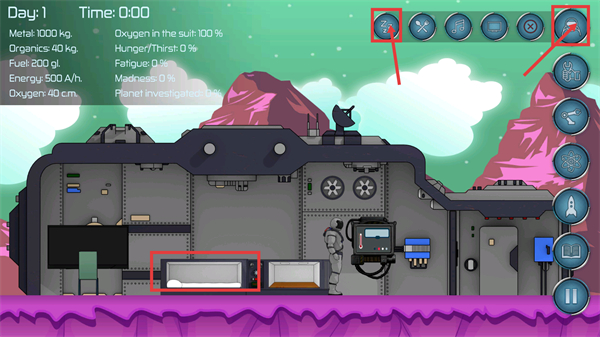 2、进入舱内后,利用【睡眠舱】设施,配合顶部【睡眠图标】可恢复状态,同时留意界面功能按钮的交互逻辑。