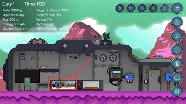 3、时间推进后【Fatigue:7%】【Madness:2%】会上升,及时使用睡眠舱降低疲劳,避免负面状态累积影响生存。