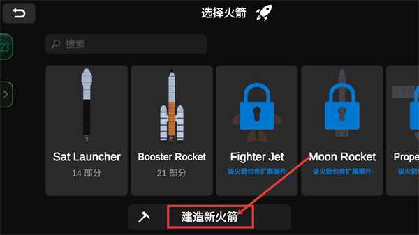 1、在【选择火箭】界面,可选用【Sat-Launcher】等已解锁火箭,或点击【建造新火箭】创建自定义火箭,拓展部件需解锁后使用。