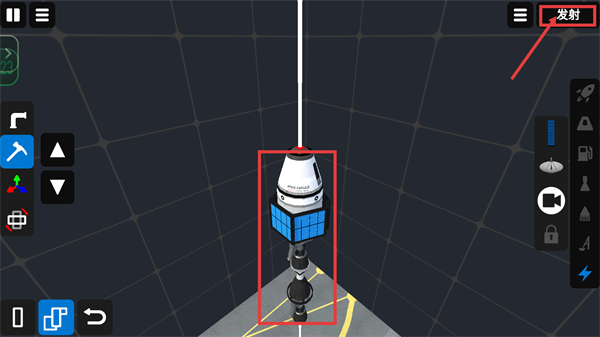 2、完成航天器装配后,点击右上角【发射】按钮,即可进入发射流程,需确保火箭结构装配完整以保障发射稳定。