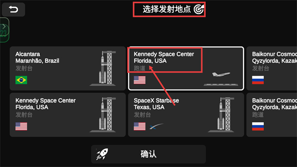 3、在【选择发射地点】界面,选定【Kennedy-Space-Center】等场地后点击【确认】,即可锁定发射位置推进流程。