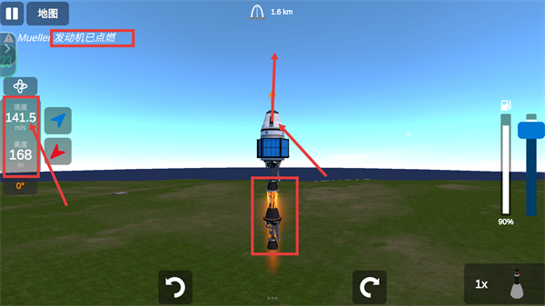 4、发射后【发动机已点燃】,需关注【速度-141.5-m/s】【高度-168-m】等参数,实时调整以保障火箭稳定升空。