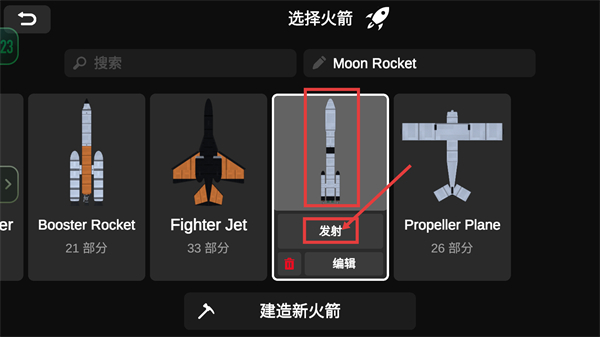 1、在【选择火箭】界面选定【Moon-Rocket】后,点击下方【发射】按钮即可启动该火箭的发射流程,也可通过【编辑】调整火箭结构。