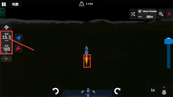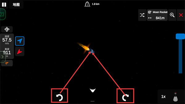 3、升空过程中可通过底部旋转按钮调整火箭角度,配合【速度-57.5-m/s】的提升,控制飞行轨迹以适配后续轨道。