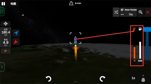 4、当高度达【4.9-Km】时,需留意右侧【温度】与【燃料-63%】状态,合理调控推进功率,保障火箭持续稳定飞行。