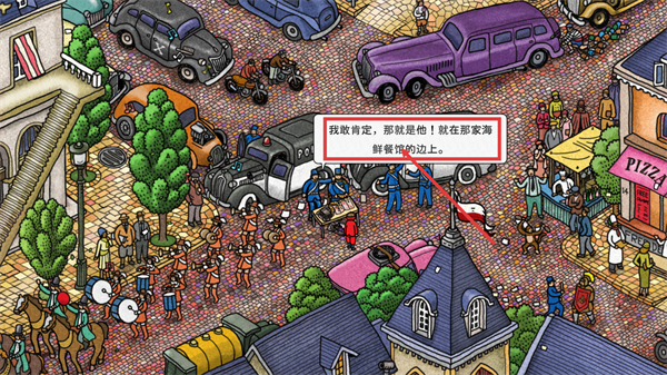 4、追踪标识角色的移动路径,在车辆与建筑间的区域找到该角色,点击完成后续交互。