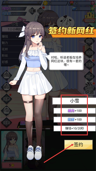 1、确认【小雪】的属性加成(魅力+100、花样+100),点击【签约】按钮完成该网红的签约流程。