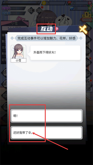 2、在【互动】界面选择对应回复选项,完成对话互动以提升角色的魅力、花样与好感属性。