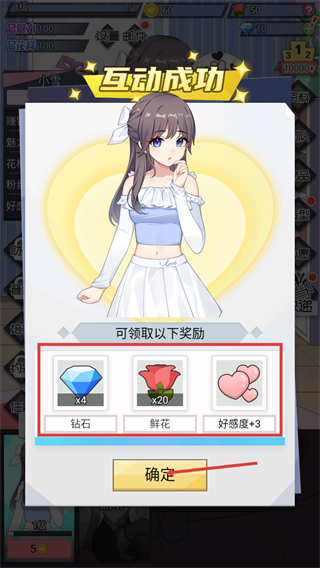 3、互动成功后点击【确定】,领取【钻石x4】【鲜花x20】【好感度+3】的奖励,推进养成进度。