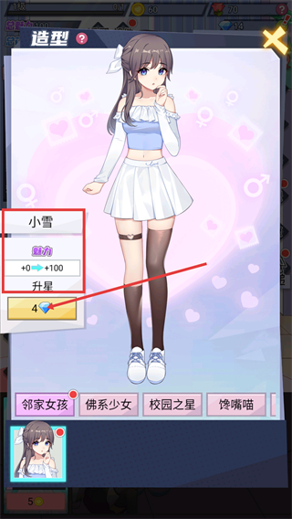 4、进入【造型】界面,消耗4钻石为【小雪】升星,将其魅力属性提升至+100,强化网红能力。