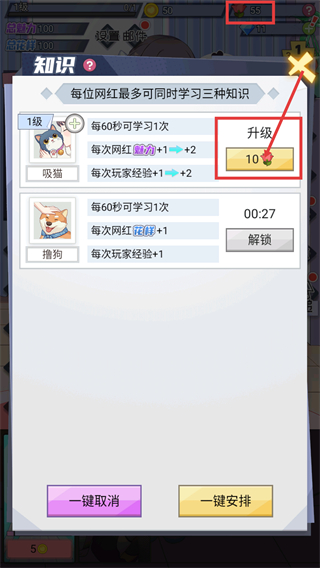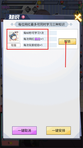 2、在知识界面点击【解锁】,开启【吸猫】学习项,每60秒可提升网红魅力与玩家经验。