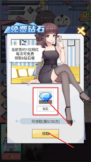 4、在【免费钻石】界面点击【领取】,获取6钻石奖励,用于后续网红养成的资源消耗。