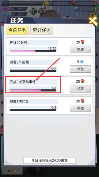 1、在【今日任务】中,优先推进【完成3次互动事件-2/3】,可通过对应入口触发互动以达成进度。