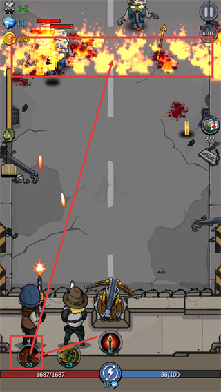 2、在【1-5】关卡中,使用【30-能量】类武器技能,可对僵尸造成高额范围伤害,快速推进战斗进度。