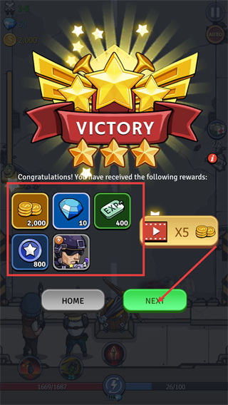 4、通关【1-5】后获得【VICTORY】奖励,包含【2000-金币】【10-钻石】等资源,点击【NEXT】可挑战下一关。
