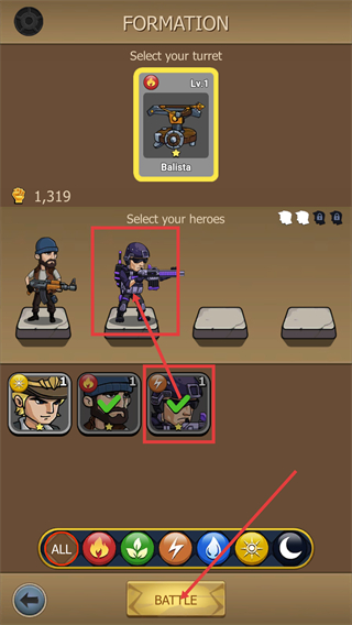 1、在【FORMATION】界面,选择【Balista】炮塔与对应英雄后,点击【BATTLE】即可进入关卡战斗。
