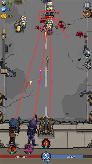 3、攻击僵尸时触发【Critical】暴击效果,能大幅提升单体伤害,优先针对血量较高的敌方单位。