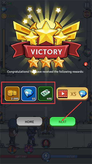 4、通关【1-6】后获得【VICTORY】奖励,包含【2000-金币】【10-钻石】等,点击【NEXT】可挑战下一关。