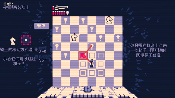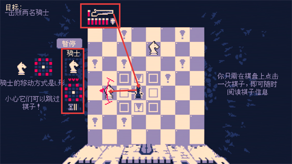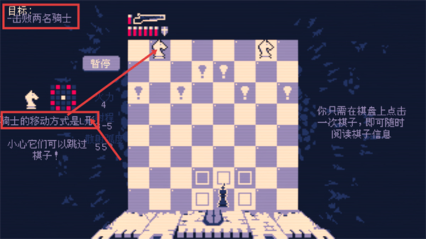 1、目标为击败两名骑士,需注意【骑士的移动方式是L形】且可跳过棋子,规划移动路径避开其攻击范围。