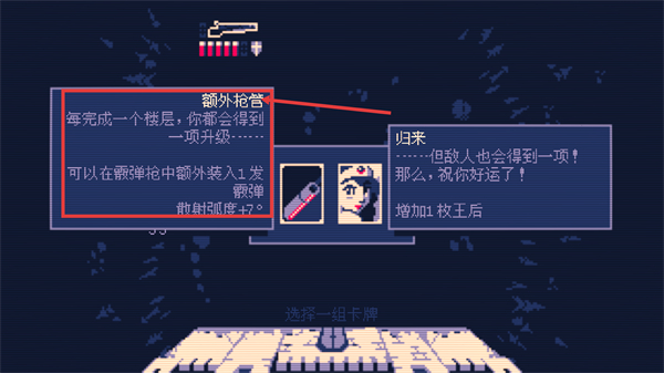 4、完成楼层后可选择【额外枪管】升级,能额外装1发霰弹且散射弧度+7°,同时敌方会新增1枚王后。