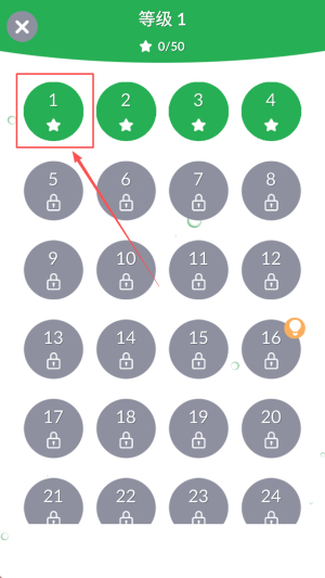 2、选择等级:在等级界面,点击“等级1”图标,解锁0/50星关卡,开始初级挑战。
