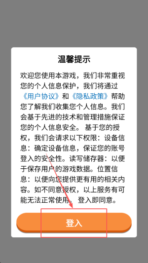 1、进入游戏:首先打开游戏主界面,阅读温馨提示后点击“登入”按钮,进入主菜单。