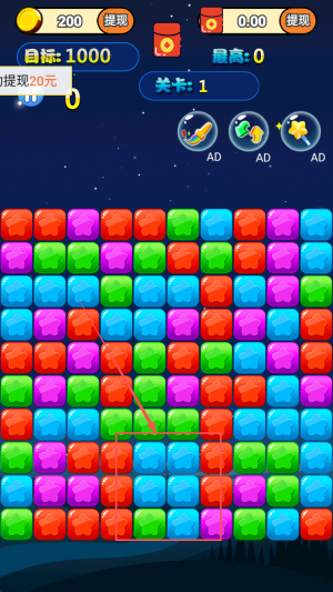 3、开始挑战:查看目标1000分与最高0分记录,点击“关卡1”按钮,开始消除方块攒积分。
