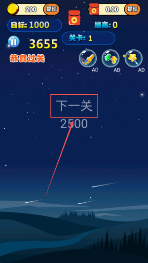 4、通关提现:当画面弹出“恭喜过关”并显示3655分,点击“下一关”按钮,继续挑战更高关卡。