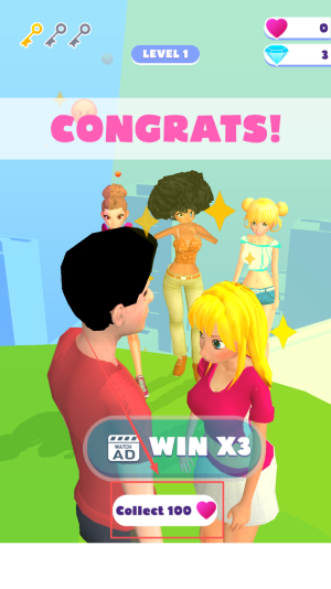 4、领取奖励:当画面显示“CONGRAtS! Collect100”,点击“Win X3”按钮,观看广告领取三倍奖励并进入下一关。