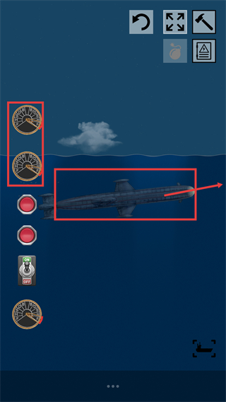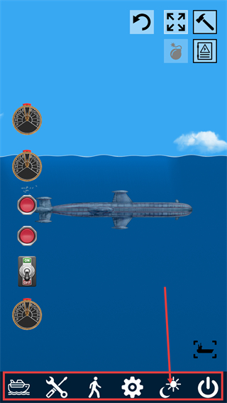 2、界面底部有功能栏,点击对应图标可切换模式,同时通过【ON-OFF】开关控制潜艇运行状态。